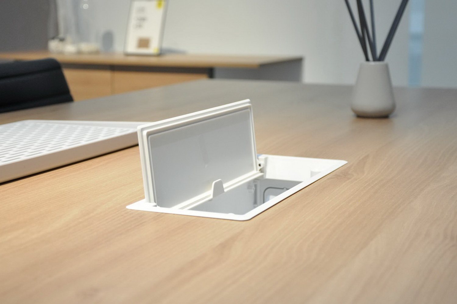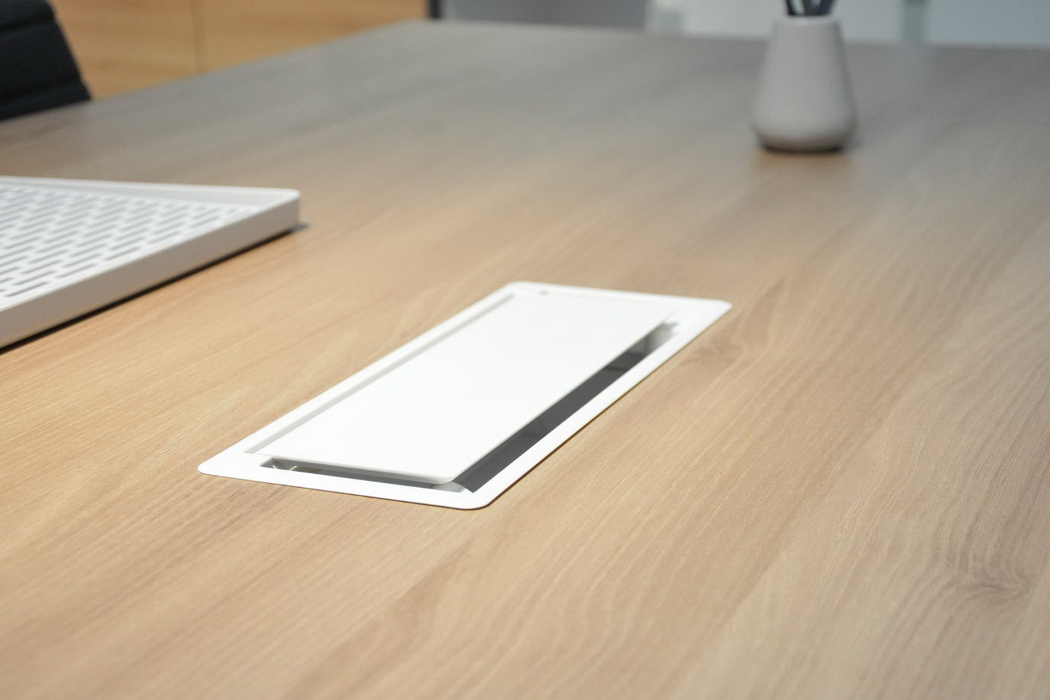 Пластиковая рамка с плавным закрыванием придает рабочему месту или столу для переговоров эстетичный внешний вид.